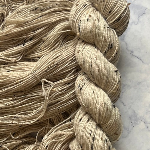 A blend of BFL, from the British breed of Bluefaced Leicester sheep, and Nylon, this English fibre with its characteristic tweed has a look and definition of mesh that is particularly lovely. Emilia & Philomene likes to use tweed as an alternative to the popular speckles colours.